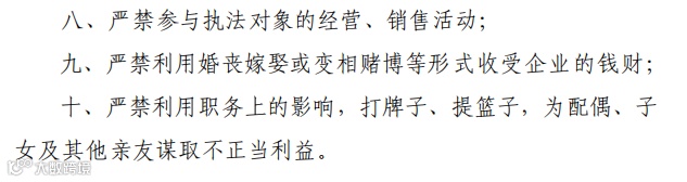 《规定》共有十条明令禁止的行为,明确了执法人员必须严格公正执法,依法依规办理环境违法案件,不得索拿卡要、讲私情,办关系案、人情案;进一步规范执法人员与执法对象的日常交往,不得接受当事人的宴请、参加其邀请的娱乐旅游等活动;禁止执法人员利用岗位工作之便和职务影响,参与执法对象的经营、销售等活动,谋取不正当的利益。坚持要把纪律和规矩挺在前面,执法人员时刻做到廉洁自律,坚决守住底线,不越红线,不碰高压线。