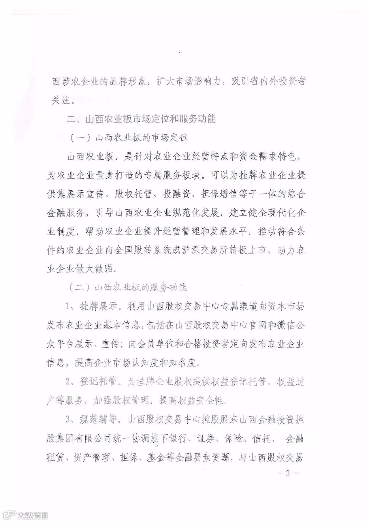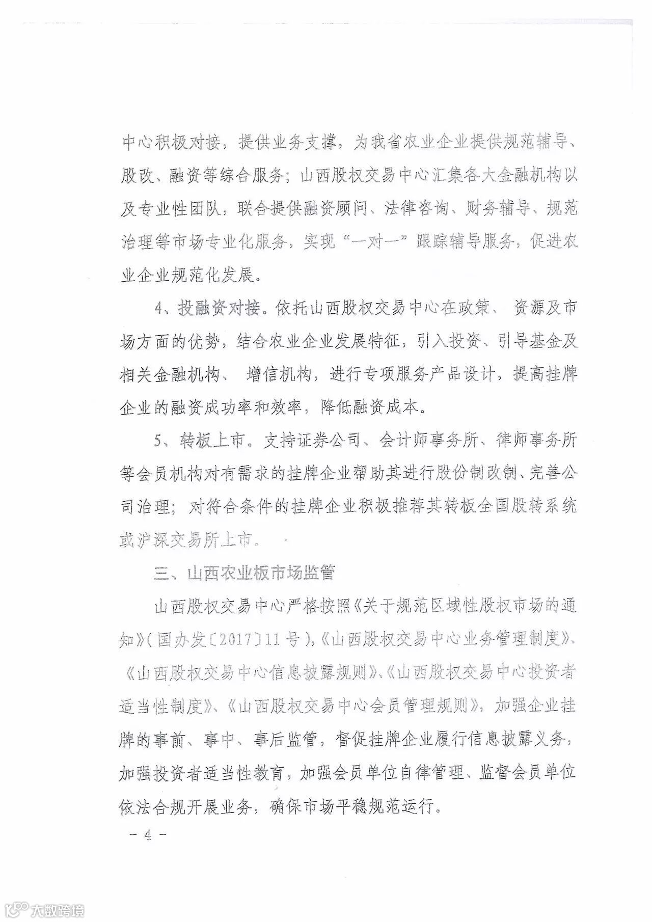 山西股权交易中心是服务于山西省行政区域内中小企业的私募股权市场和地方人民政府扶持中小微企业政策措施的综合运用平台。设立“农业板”对建立农业龙头企业和贫困地区农业企业预备上市企业库具有重要意义。“农业板”设立后,将实现省内农业企业与资本市场的有效对接,为企业带来集宣传展示、登记托管、股权融资、债券融资、资产证券化、转板上市等全方位的综合金融服务。