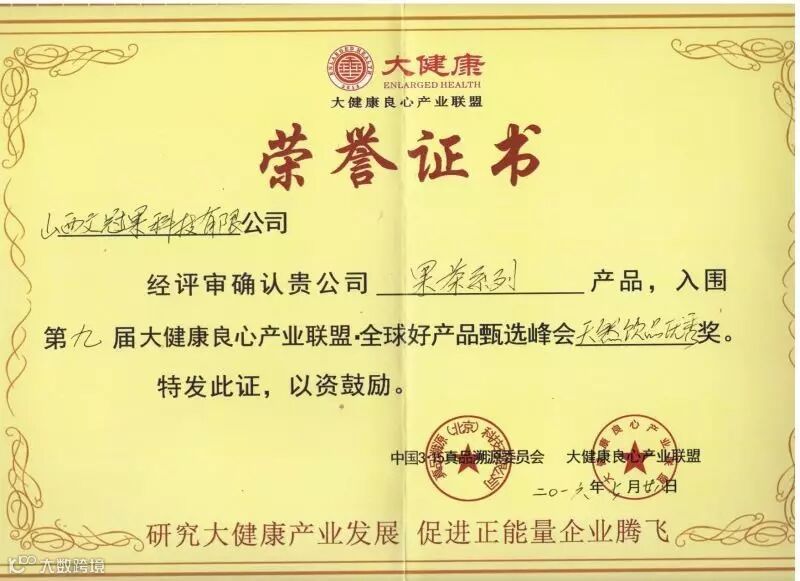 第九届大健康良心产业联盟·全球好产品甄选峰会天然饮品优秀奖。