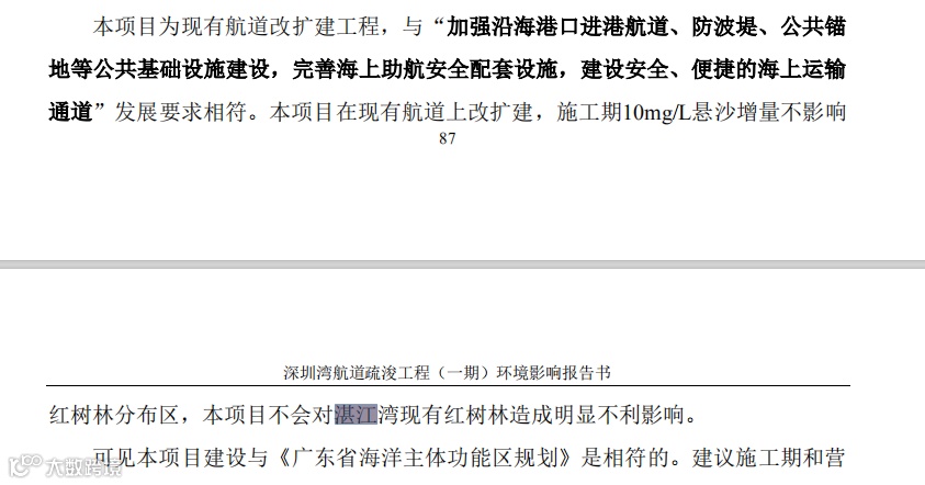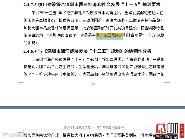 见圳客户端·深圳新闻网2020年3月27日(见圳客户端、深圳新闻网记者 钟鸿冰)3月27日,有网友向深圳新闻网记者反映,《深圳湾航道疏浚工程(一期)环境影响报告书送审稿公众参与公示的公告》出现错误,文中多处出现将“深圳湾”表述成“湛江湾”,“深圳市”表述成“湛江市”等地方性表达错误。对此,记者从深圳市交通运输局官方公布的《深圳湾航道疏浚工程(一期)环境影响报告书送审稿》(以下简称《环评报告》)进行求证。