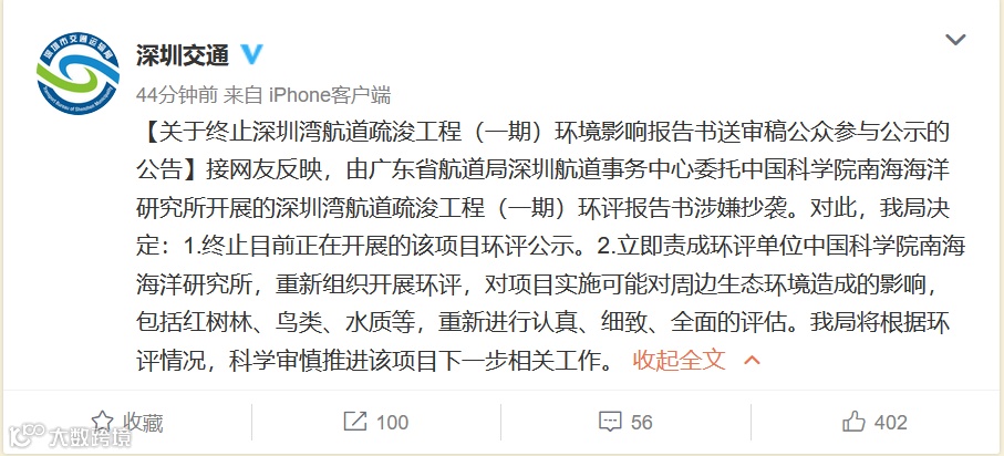 3月27日21时10分,深圳市交通运输管理局官方微博发布消息称:接网友反映,由广东省航道局深圳航道事务中心委托中国科学院南海海洋研究所开展的深圳湾航道疏浚工程(一期)环评报告书涉嫌抄袭。对此,深圳市交通运输管理局决定:1.终止目前正在开展的该项目环评公示。2.立即责成环评单位中国科学院南海海洋研究所,重新组织开展环评,对项目实施可能对周边生态环境造成的影响,包括红树林、鸟类、水质等,重新进行认真、细致、全面的评估。深圳市交通运输管理局将根据环评情况,科学审慎推进该项目下一步相关工作。