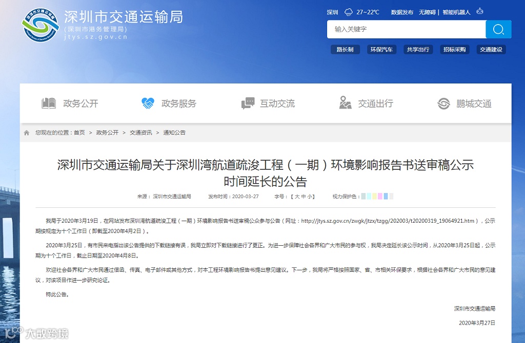 见圳客户端·深圳新闻网2020年3月27日讯(见圳客户端、深圳新闻网记者 钟鸿冰)3月27日,记者从深圳市交通运输局了解到,该局发布的《深圳湾航道疏浚工程(一期)环境影响报告书送审稿公众参与公告》因下载链接有误,对此公告延长公示期,自3月25日发现之日起十个工作日,至4月8日截止公示。(深网报道:http://in.sznews.com/content/2020-03/26/content_23003428.htm)