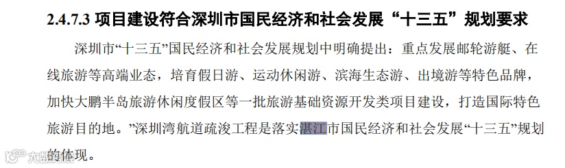 记者在《环评报告》中看到,有关表述存在错误属实,在对深圳湾航道疏浚工程(一期)项目可实现的目标的阐述中,将“深圳市的目标”阐述为“湛江市的目标”;将“深圳湾红树林”表述成“湛江湾红树林”;将“深圳市国民经济”表述成“湛江市国民经济”;将“深圳海事局”表述成“湛江海事局”等。