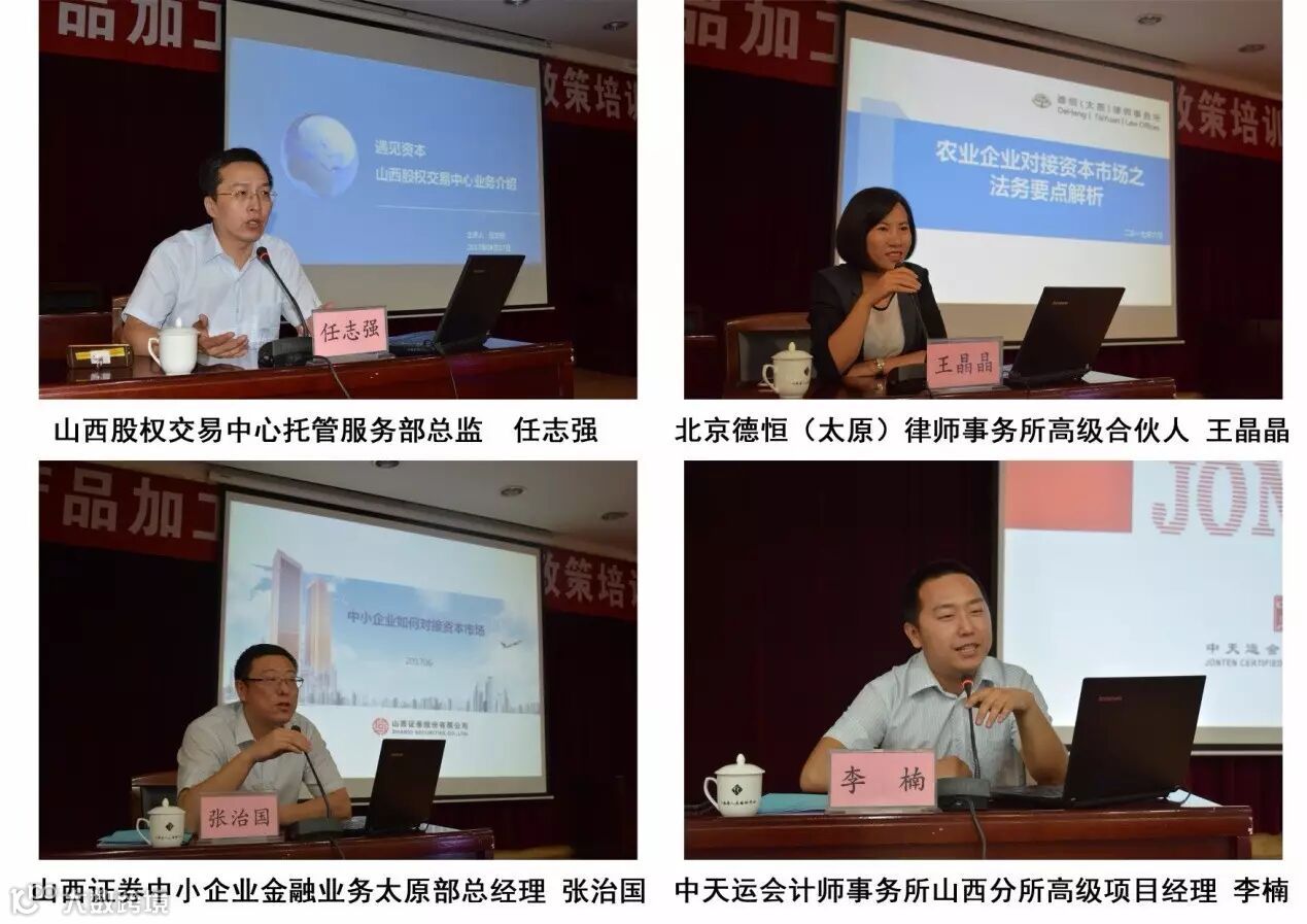 本次培训会特邀山西股权交易中心托管服务部总监任志强、北京德恒(太原)律师事务所高级合伙人王晶晶、山西证券中小企业金融业务太原部总经理张治国、中天运会计师事务所山西分所高级项目经理李楠分别为企业家带来了《遇见资本—山西股权交易中心业务介绍》、《农业企业对接资本市场之法律要点解析》、《中小企业如何对接资本市场》和《企业股改财务规范实战讲解》四场金融业务专题培训。四位专家分别就多层次资本市场宏观架构及支持政策、山西股权交易中心业务模式、农企对接资本市场常见问题及法律解析、企业股份制改造及挂牌上市的意义及方式、企业股改中的财务痛点及应对措施等内容进行了系统介绍。