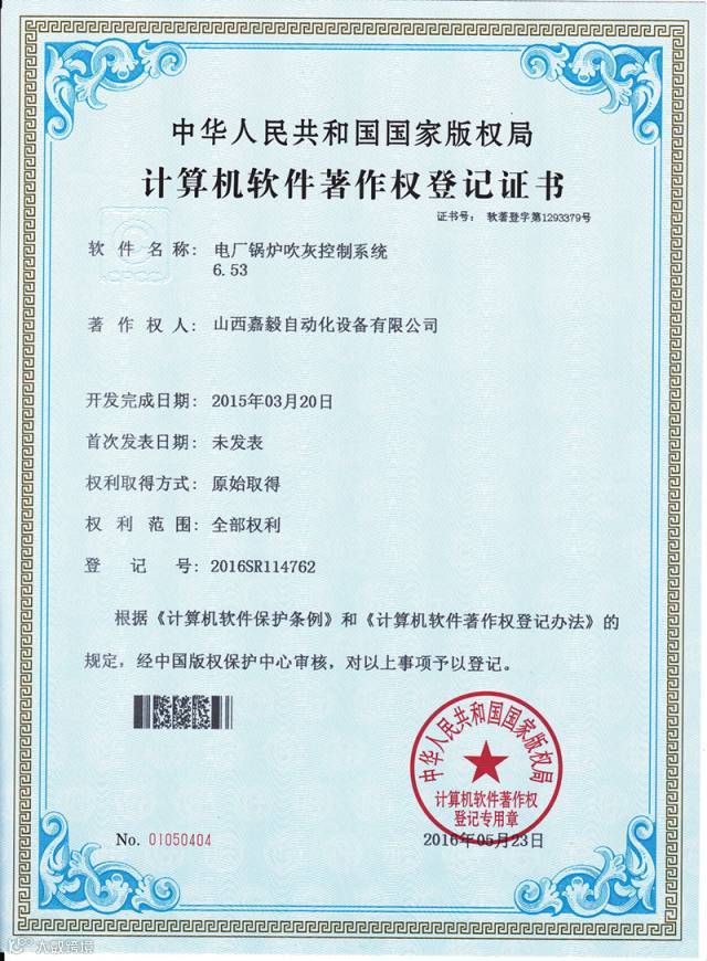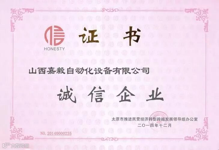 公司先后获得由中华人民共和国国家版权局颁发的“鼓风机控制系统”、“焦炉自动放散点火控制系统”、“天然气定量装车控制系统”、“污水厂污水处理控制系统”、“电厂锅炉吹灰控制系统”计算机软件著作权登记证书;2016年5月12日获得上海英特尔认证有限公司认证的质量管理体系认证(ISO9000)证书,认证编号:11716Q10382R0S,认证范围:自动化控制系统集成,有效期三年;2014年山西嘉毅自动化设备有限公司被评为“太原市中小微诚信企业”。