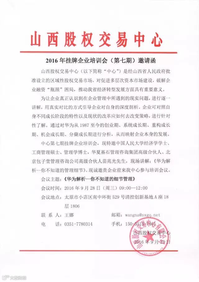 导读:山西股权交易中心2016年挂牌企业培训会(第七期)邀请函