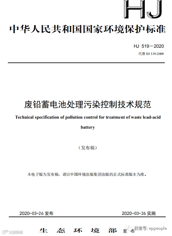 自上述标准实施之日起,《废铅酸蓄电池处理污染控制技术规范》(HJ 519-2009)废止。