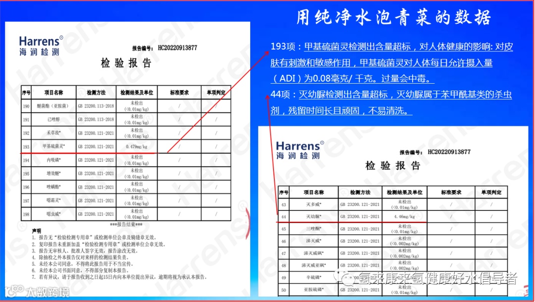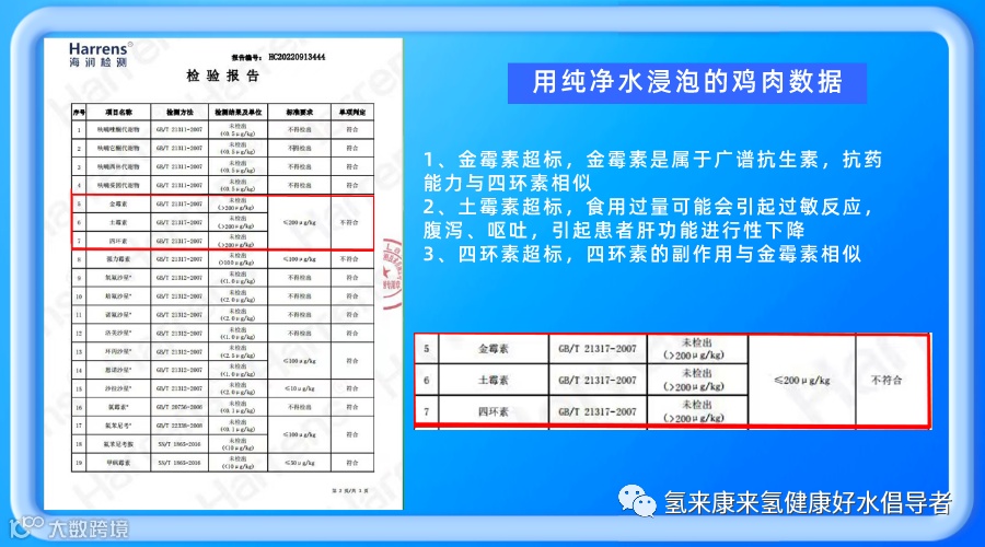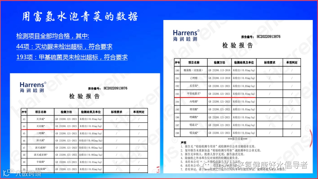 另外氢来康来科技自主研发的矿石制氢系列富氢产品所产的水质为高氢、弱碱、低频小分子团活性水、富含微量元素,其中低频小分子团活性水这一特点使水本身的溶解性、渗透性增强,也可以去除泡发出食物中的农残激素抗生素,加上氢分子本身的作用双重叠加对食物进行作用,就可以充分去除和泡发食物中的农残激素抗生素,请大家看下我们的去农残检测报告和试验。