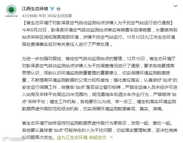 近日,江西省生态环境厅就“彭泽县空气自动监测站点涉嫌人为干扰空气站运行”一事通报称,九江市生态环境局在查清事实后对有关责任人进行了严肃处理。各地要认真排查“站点”可能存在的人为干扰问题,切实落实管理制度,坚决杜绝类似问题再次发生。