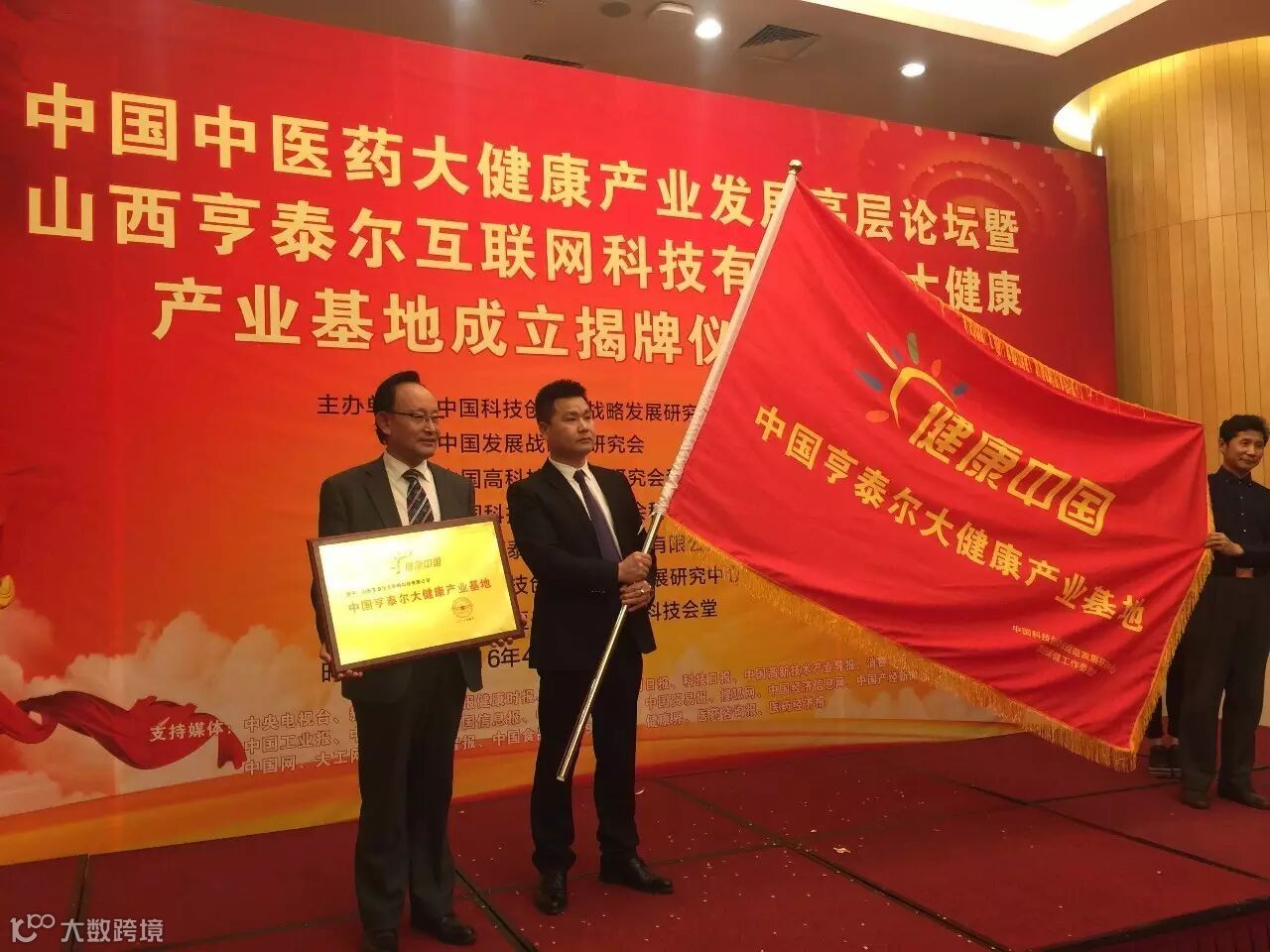3、2016年4月14日于中国科技会堂,由国务院中国科技创新与战略发展研究中心医药保健工作委员会授牌、授旗山西亨泰尔互联网科技有限公司为“中国亨泰尓大健康产业基地”,正式开启亨泰尔健康中国梦的里程。