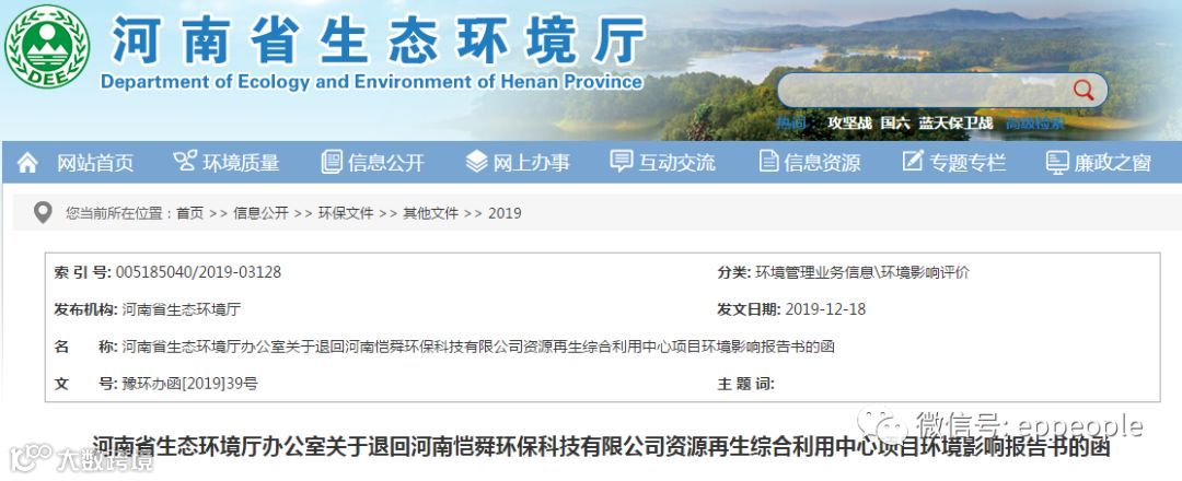 河南省生态环境厅办公室关于退回河南恺舜环保科技有限公司资源再生综合利用中心项目环境影响报告书的函