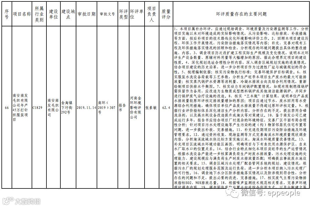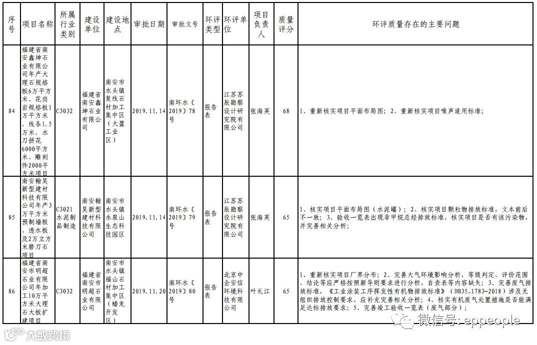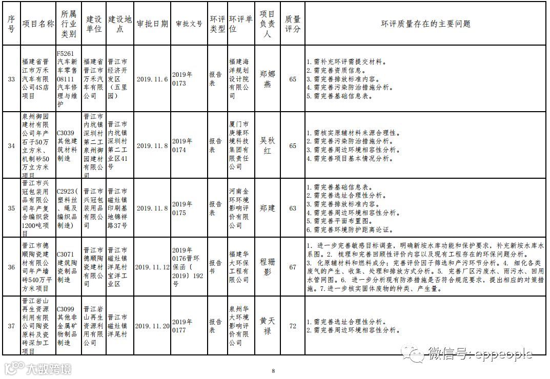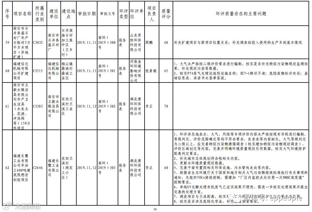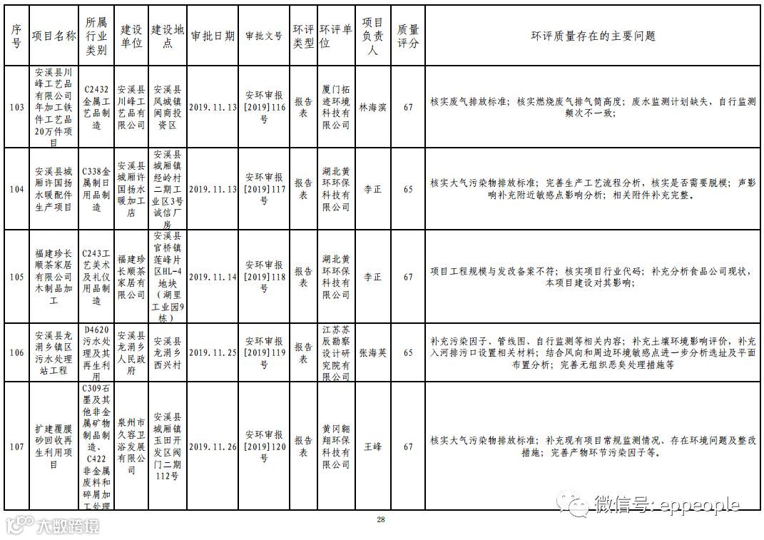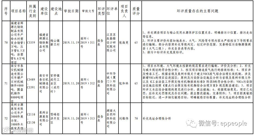从评分情况来看,全市共有8个项目环评文件编制质量评分只有60分。分别是:厦门昱润环保科技有限公司编制的泉州宏泰机械有限公司改建喷漆车间项目(编制主持人:林永华);江苏苏辰勘察设计研究院有限公司编制的晋江市鸿翔五金制品有限公司年产金属瓶盖、底盖共5000万个项目(编制主持人:张海英)、福建福邦硅灰石矿业有限公司年产12万吨硅灰石系列产品深加工项目(编制主持人:郑义);三明市国投环境科技研究有限公司编制的晋江市南港污水处理厂二期扩建工程(编制主持人:杨道秀);湖北黄环环保科技有限公司编制的福建长鹭工业有限公司年加工600吨建筑阻燃密封胶项目(编制主持人:李正);河南金环环境影响评价有限公司编制的惠安县亿盛建材有限公司碎石生产项目(编制主持人:万晶晶)、泉州凯格木业有限公司年产木质家具4000m³、木门200套生产项目(编制主持人:郑建);北京国环益达环保技术有限公司编制的泉州百胜包装有限公司百胜包装项目(编制主持人:高远)。