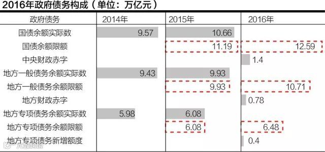 数据显示,2015年末国债余额实际数额约为10.66万亿元,比全国人大批准的2015年国债余额限额11.19万亿元要低。地方政府一般债务和专项债务实际执行数额,则紧贴批准的限额,2015年底预计执行数分别为9.93万亿和6.08万亿元。