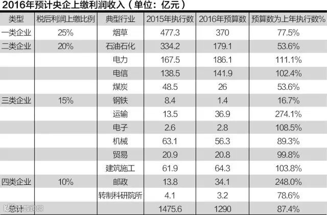 按照上述五类比例,2015年实现央企上缴利润收入执行数为1475亿元。2016年,受石油石化、钢铁、煤炭等行业企业经济效益下降,以及卷烟消费税调整导致烟草类企业税后利润减少等因素影响,2016年预计央企利润收入为1290亿元,减少185.62亿元,下降12.6%。