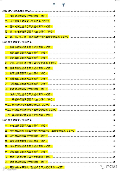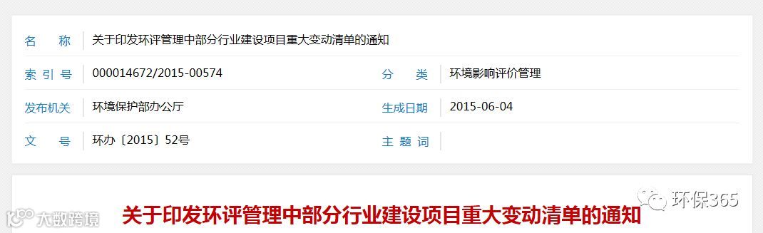 2018年,发布制浆造纸、制药、农药、化肥(氮肥)、纺织印染、制革、制糖、电镀、钢铁、炼焦化学、平板玻璃、水泥、铜铅锌冶炼、铝冶炼建设项目重大变动清单。(14个) 2019年,发布淀粉、水处理、肥料制造、镁钛冶炼、镍钴锡锑汞冶炼建设项目重大变动清单。(5个)