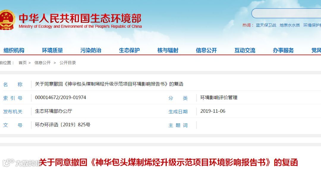 你公司《关于申请撤回〈神华包头煤化工有限责任公司关于审批神华包头煤制烯烃升级示范项目环境影响报告书的申请函〉的函》(神包煤函〔2019〕42号)收悉。