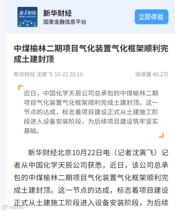 新闻梗概:中国化学工程天辰公司总承包的中煤榆林二期项目气化装置框架顺利完成土建封顶。这一节点的达成,标志着项目建设正式从土建施工阶段进入设备安装阶段,为后续项目建设筑牢基础。