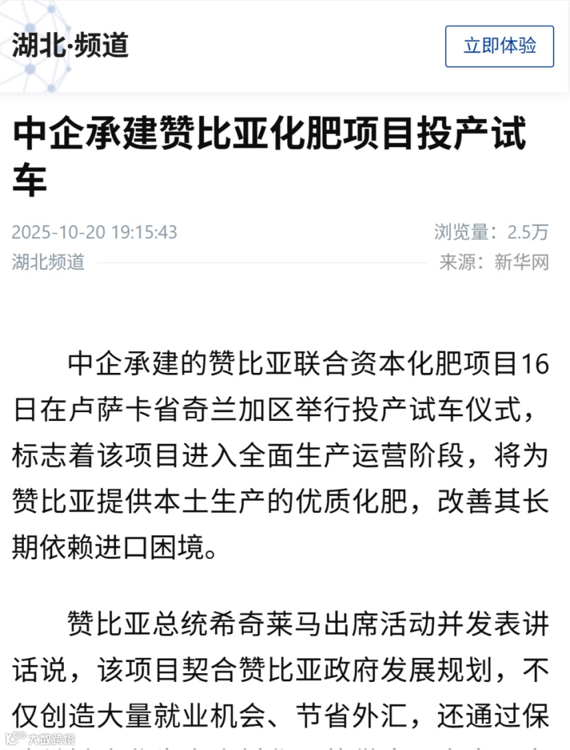 新闻梗概:中国化学工程五环公司承建的赞比亚联合资本化肥项目在卢萨卡省奇兰加区举行投产试车仪式,标志着该项目进入全面生产运营阶段,将为赞比亚提供本土生产的优质化肥,改善其长期依赖进口困境。