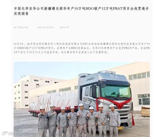 新闻梗概:中国化学工程东华公司EPC总承包的新疆曙光绿华生物科技有限公司年产10万吨BDO联产12万吨PBAT项目,在顺利产出BDO优等品后,仅用12天便顺利产出优质PBAT产品。首批PBAT产品已于10月正式投放市场,标志着该项目全面进入生产经营阶段。
