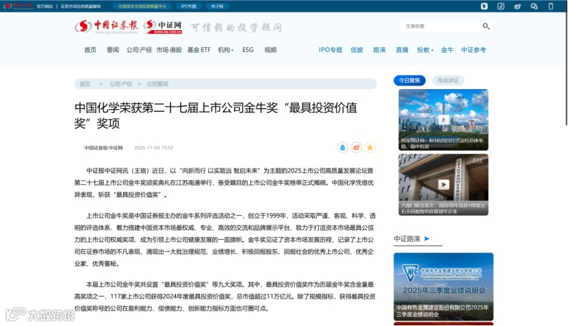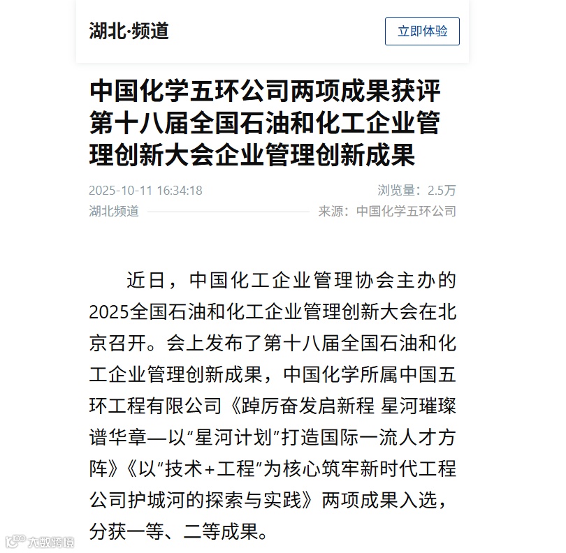 新闻梗概:中国化工企业管理协会主办的2025全国石油和化工企业管理创新大会近日在北京召开。会上发布了第十八届全国石油和化工企业管理创新成果,中国化学工程五环公司《踔厉奋发启新程 星河璀璨谱华章—以“星河计划”打造国际一流人才方阵》《以“技术+工程”为核心筑牢新时代工程公司护城河的探索与实践》两项成果入选,分获一等、二等成果。