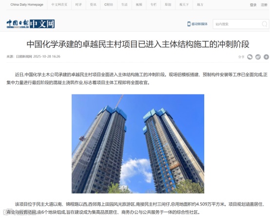 新闻梗概:中国化学工程土木公司承建的卓越民主村项目已进入主体结构施工冲刺阶段,现场铝模板搭建、预制构件安装等工序已全面完成,正集中力量进行最后阶段的混凝土浇筑作业,标志着项目主体工程即将全面收官。