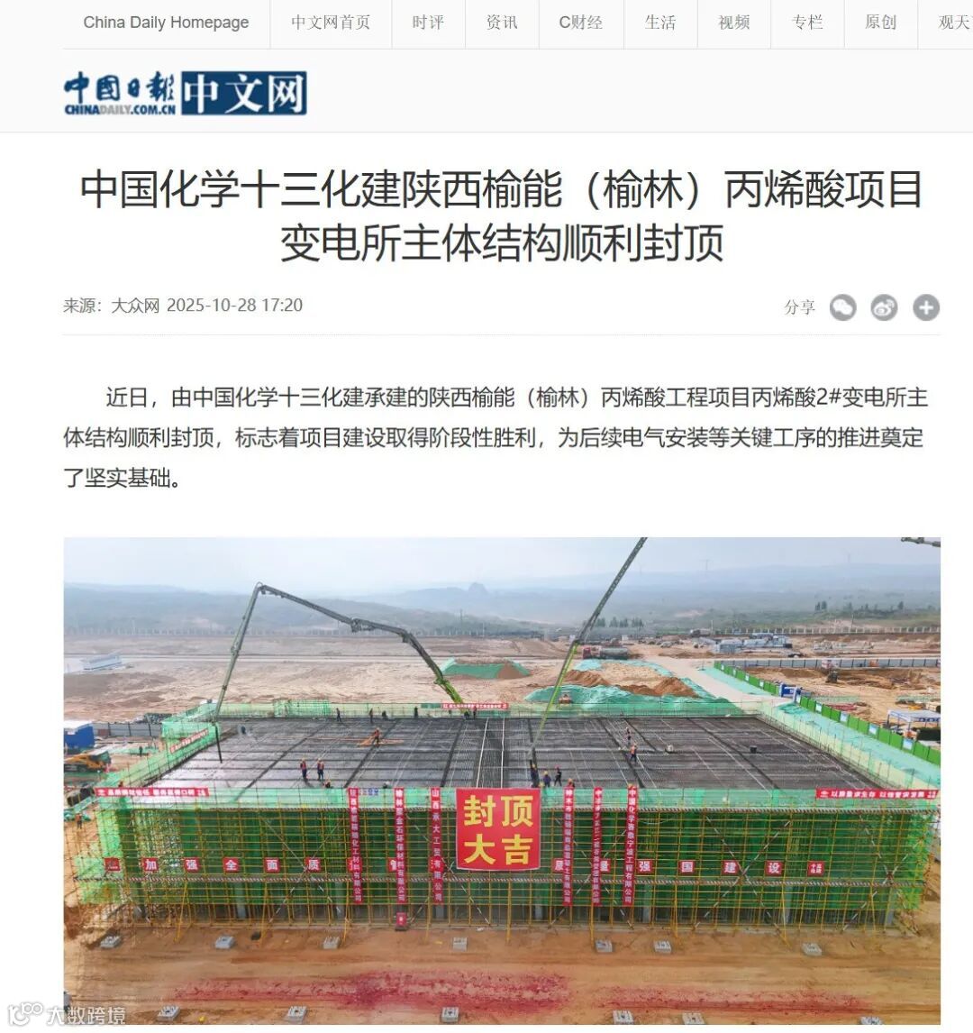新闻梗概:中国化学工程十三化建承建的陕西榆能(榆林)丙烯酸工程项目丙烯酸2#变电所主体结构顺利封顶,标志着项目建设取得阶段性胜利,为后续电气安装等关键工序的推进奠定了坚实基础。