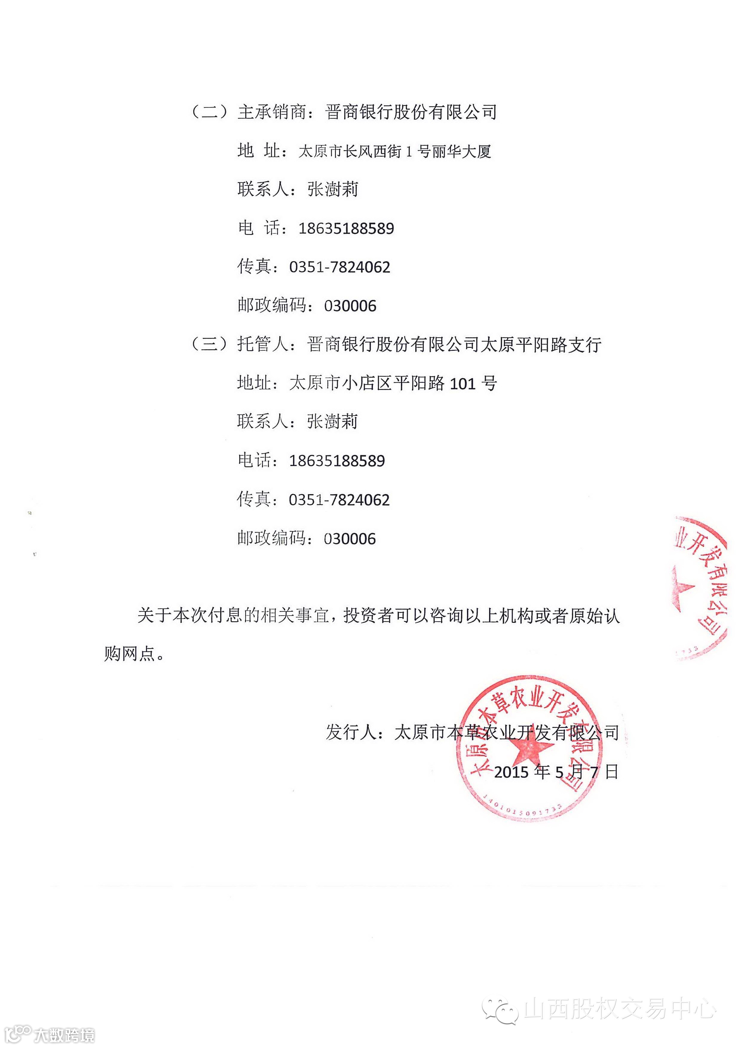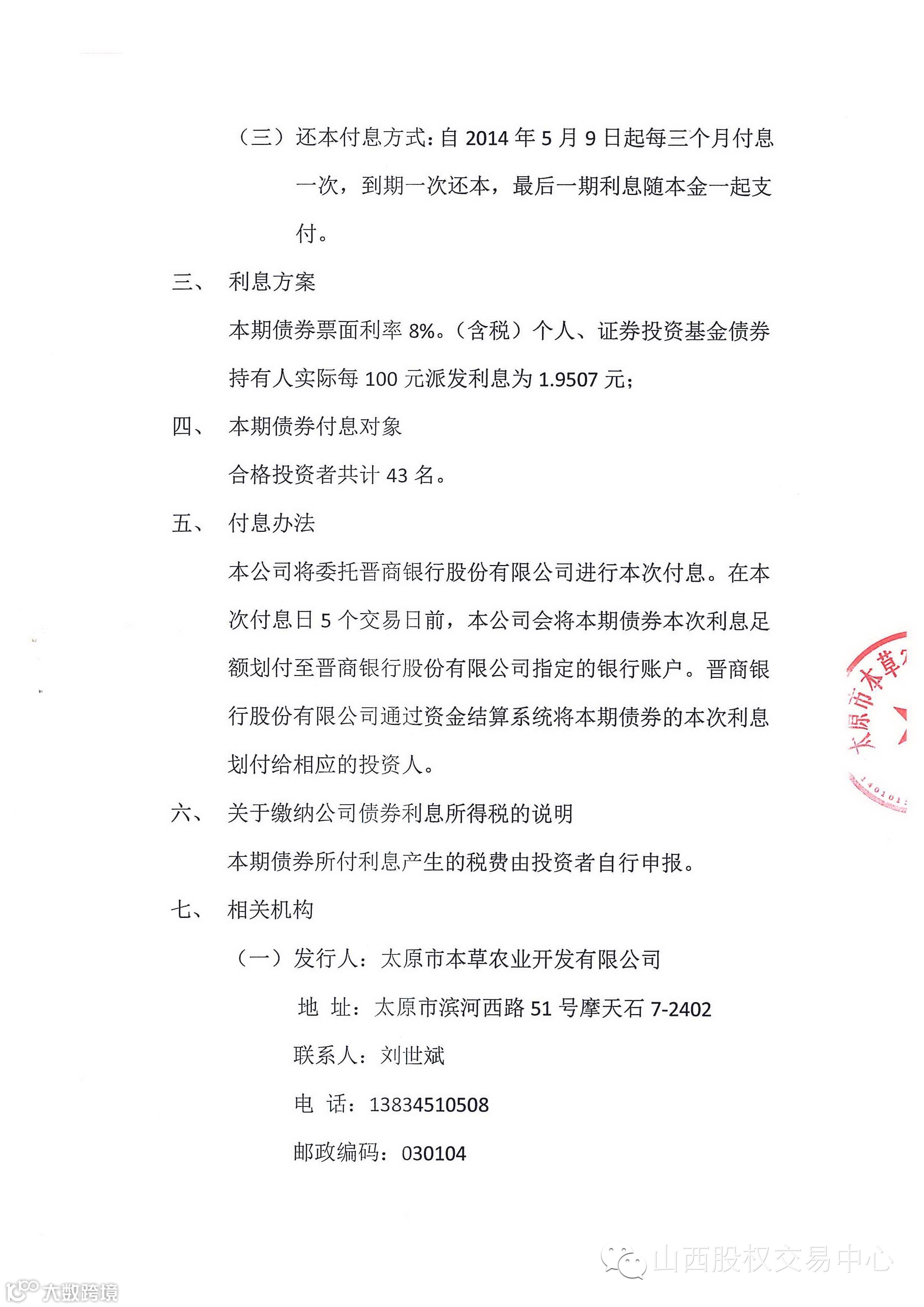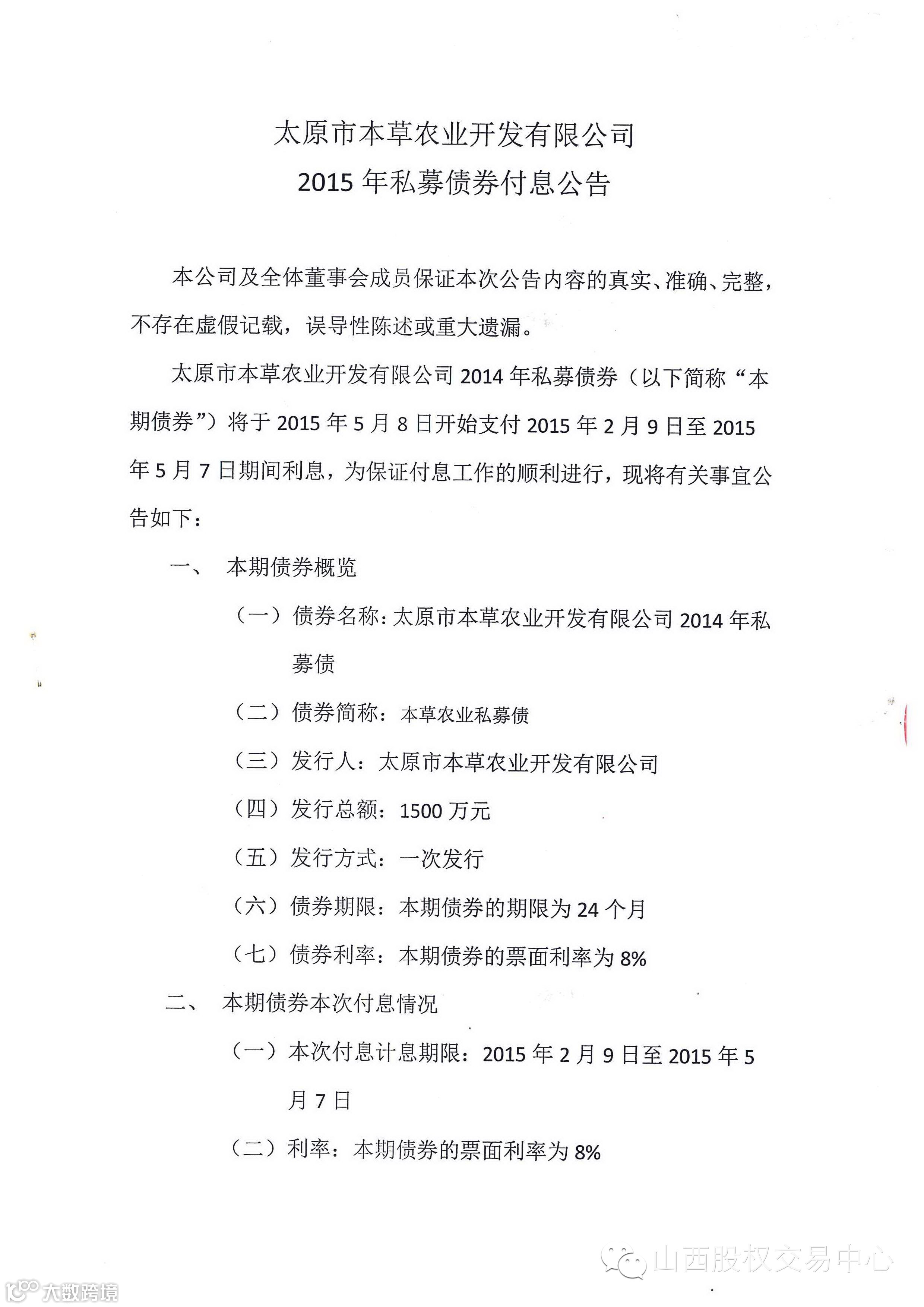 导读:太原市本草农业开发有限公司2015年私募债券付息公告