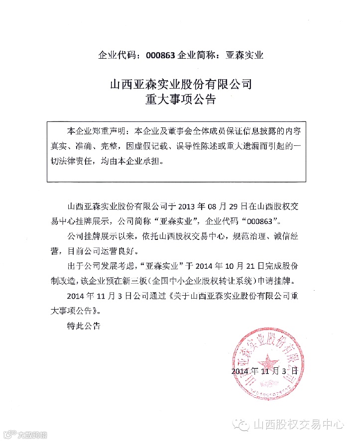【中心动态】山西亚森实业股份有限公司重大事项公告