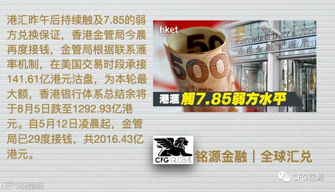汇市新闻:8月4日,港元汇价持续触及7.85弱方兑换水平,香港金管局根据联系汇率机制,在美国交易时段承接141.61亿港元沽盘,为本轮最大额,香港银行体系总结余将于8月5日跌至1292.93亿港元。自5月12日凌晨起,金管局已29度接钱,共2016.43亿港元。