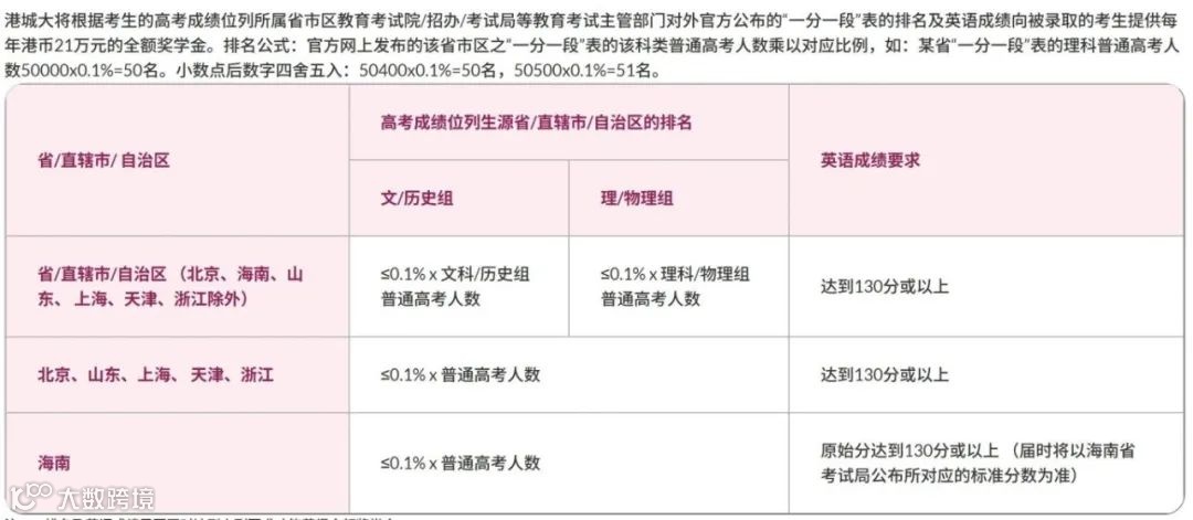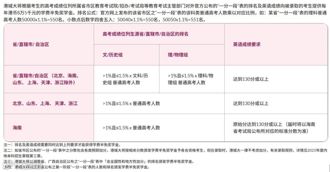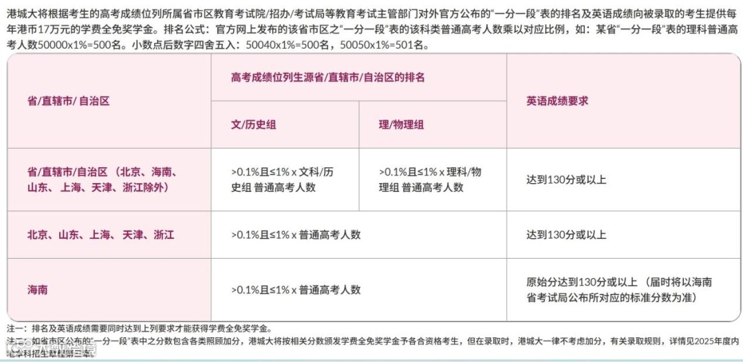 全额奖学金:给予各省/直辖市/自治区名列第一至十名内的高考生(以高考实际分数排名为准),学生将获发相等于攻读四年本科课程的学费,以及每年66,000港元住宿及生活津贴;