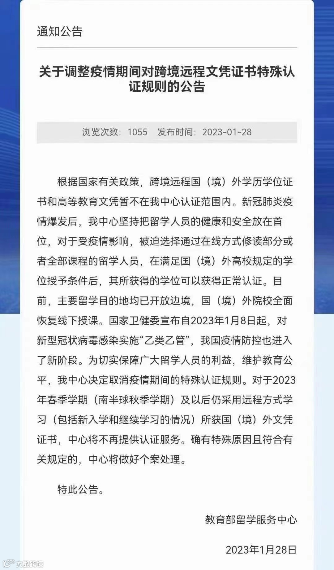 1月28日,教育部留学服务中心发布《关于调整疫情期间对跨境远程文凭证书特殊认证规则的公告》。