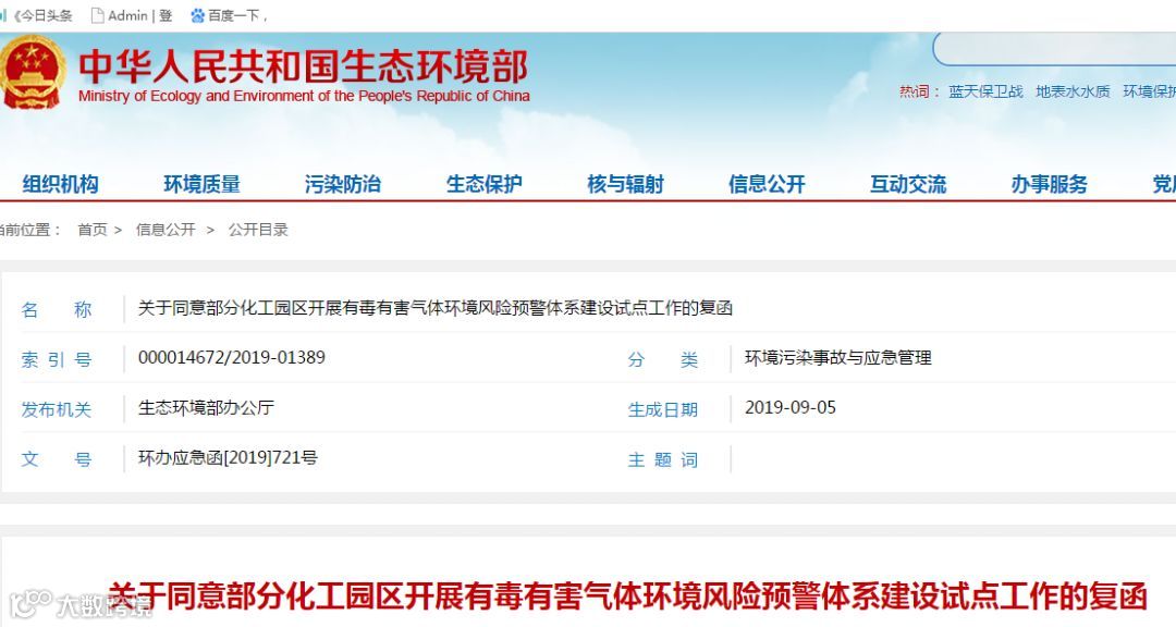 关于同意部分化工园区开展有毒有害气体环境风险预警体系建设试点工作的复函