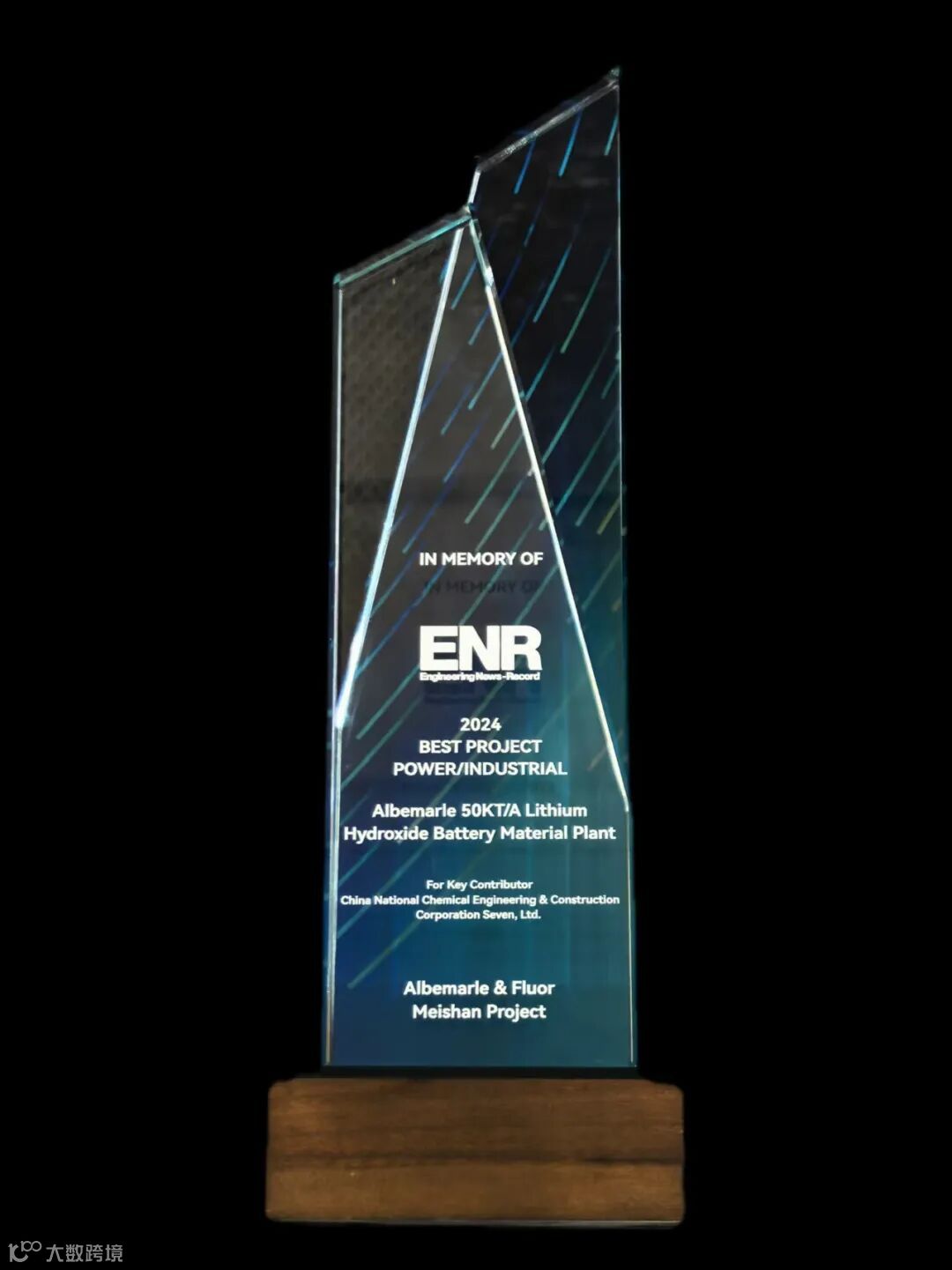 Recently, the Meishan Albemarle 50KT/A Lithium Hydroxide Battery Material Plant, co-constructed by China National Chemical Engineering & Construction Corporation Seven, Ltd., was honored with the 2024 Best Project Power/Industrial by Engineering News-Record (ENR), an internationally authoritative engineering journal. The project boasts a production capacity of 50KT/A lithium hydroxide, sufficient to power more than 15 million electric vehicles. It can reduce carbon dioxide emissions by over 100 million tons throughout the battery lifecycle.