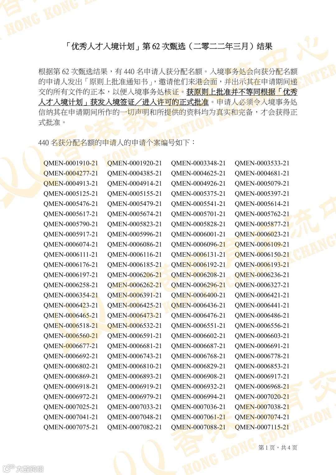3月31日,香港入境处公布了2022年第一批(总第62期)优才计划甄选结果!本次共有440名申请人获分配名额。