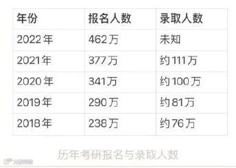 近期,关于国内考研的热度居高不下。据最新网络消息显示,2022年考研人数已达到462万人,较去年同期上涨85万人,再创历史新高。