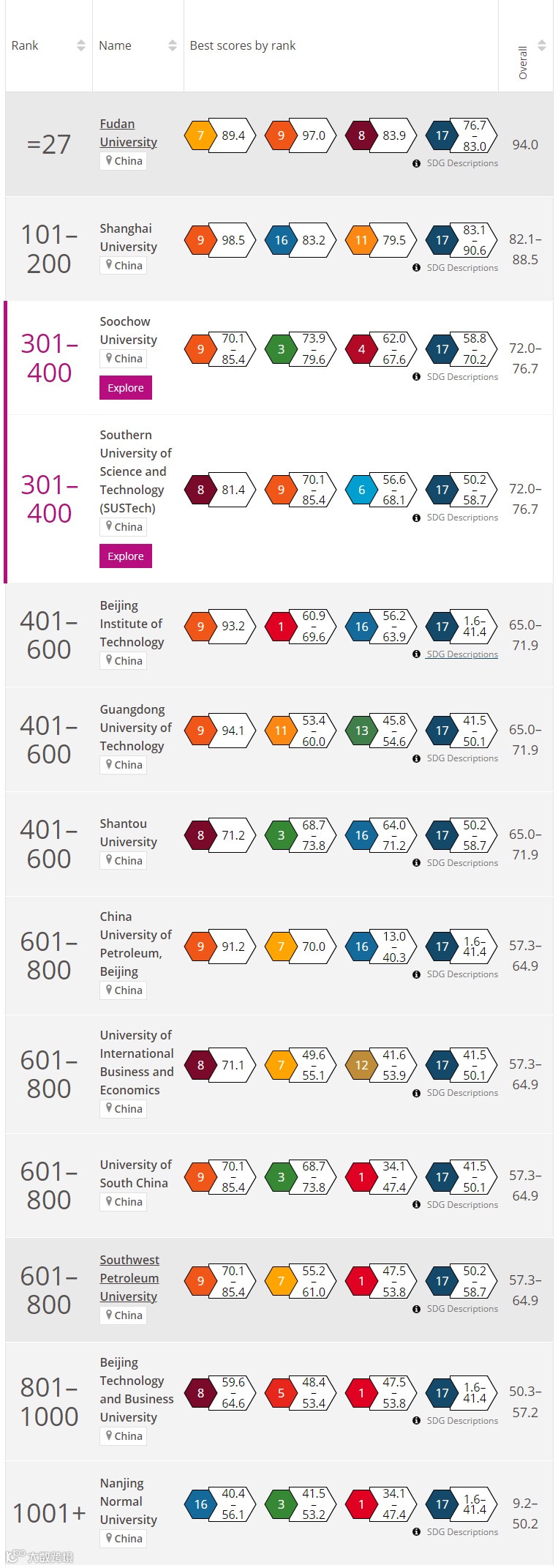 复旦大学表现佳,在全球总排名中位列第27名,并在SDG7(经济适用的清洁能源)单项中排名世界第一, SDG 8(体面工作和经济增长)的单项排名中位列世界第二名。