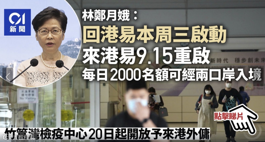 除此之外,针对于内地及澳门的非本港居民的【来港易】将于9月15日推出,非本港居民可经深圳湾口岸及港珠澳大桥口岸来港,每日名额各1000个,合共2000个名额,检疫及通关要求与【来港易】一致。