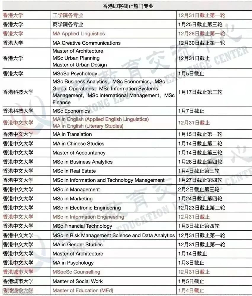 同时大家还要注意各个专业也有自己的截止时间,小编同样也为大家整理了那些港校即将截止申请的热门专业,大家千万要看清楚了!其他专业大部分也即将截止第一轮申请,想了解的同学可以联系小编沟通,获取专业资料!
