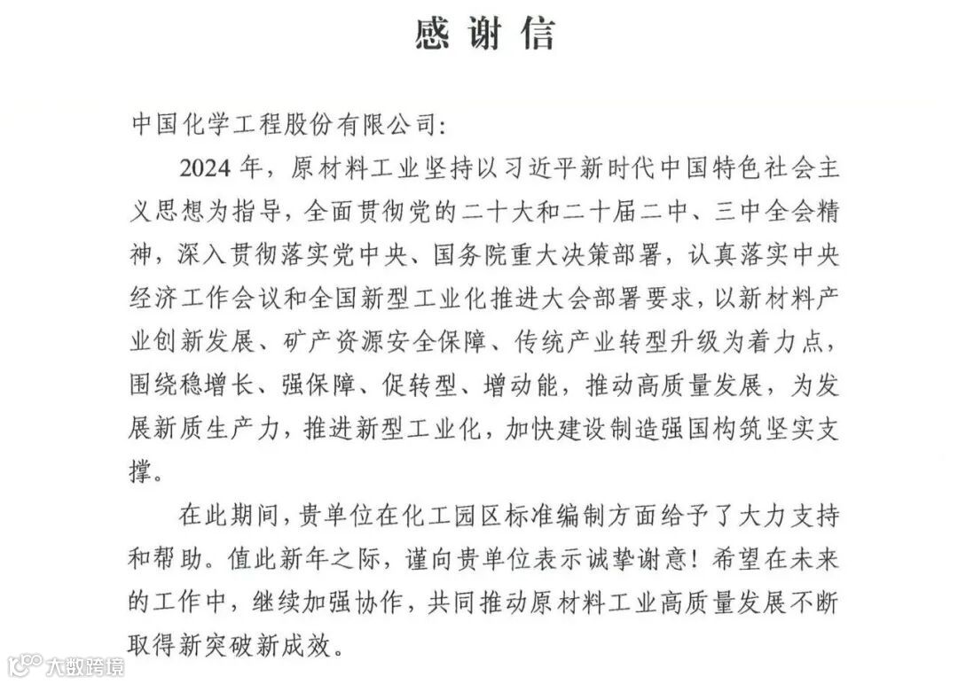 近日,中国化学收到工业和信息化部发来的感谢信,对股份公司在化工园区标准编制工作中作出的积极贡献表示感谢。