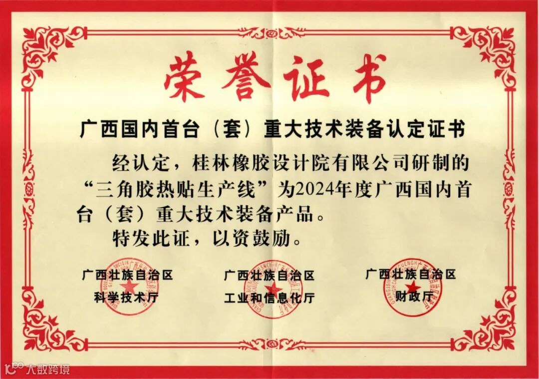 三角胶热贴生产线产品主要应用于全钢子午线载重胎的胎圈生产,投产运行后可实现单个胎圈生产用时小于20秒,较行业水平提升10%;双工位日产量超过7000个,较行业水平提升16%。该产品拥有发明专利9件(其中西班牙授权专利1项)、实用新型专利13件,为轮胎行业绿色、高效、智能制造提供重大先进技术支撑,推动轮胎行业向更高质量发展。产品也凭借先进工艺方法技术以及高度集成化、自动化、数字智能化性能优势,日前获得了2024年度广西国内首台(套)重大技术装备认定。