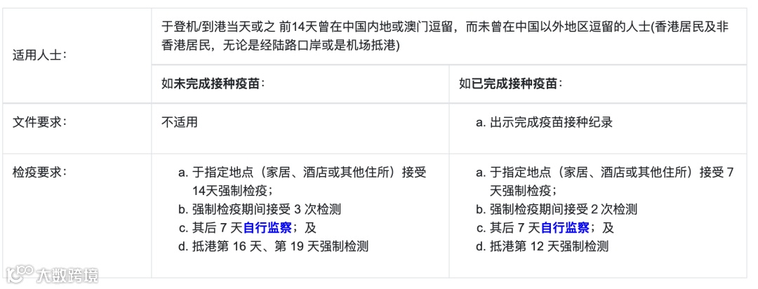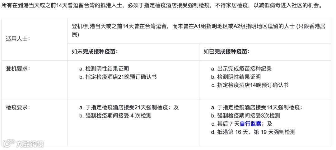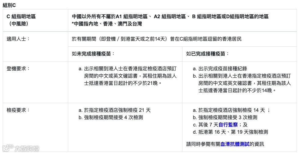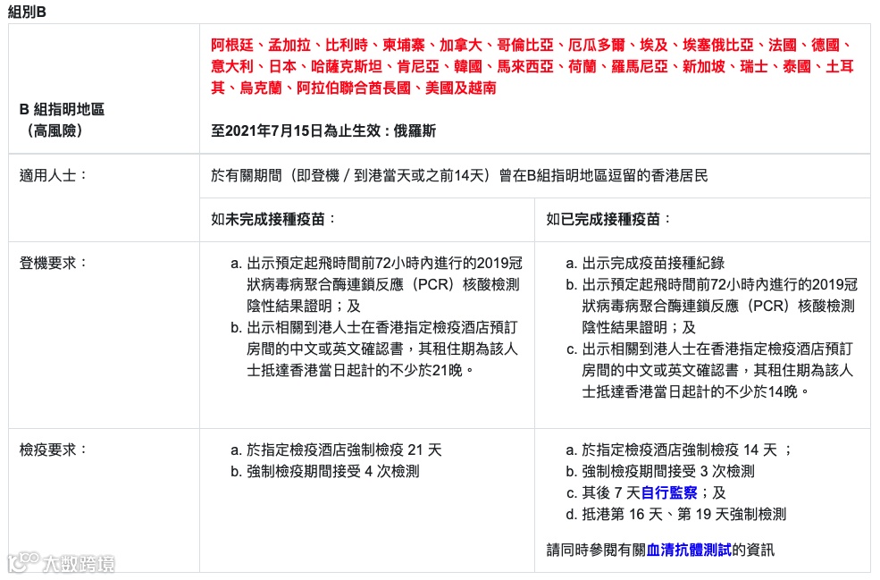 由2021年6月30日起,在抵港当天或之前14天只曾逗留B组指明地区、C组指明地区或台湾的抵港人士,如已完成接种疫苗,取得血清抗体测试阳性结果,其强制检疫期可获缩短。