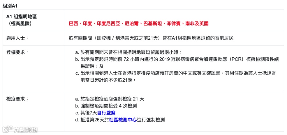 于登机当天或之前21天曾逗留指明极高风险(A1组)地区两小时的人士,将不会获准登机前来香港。