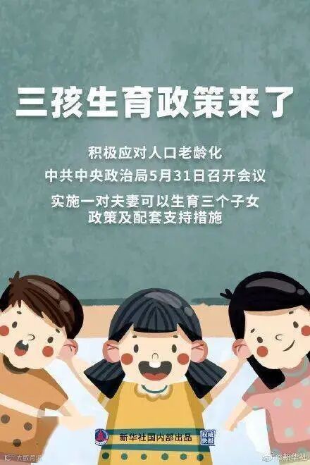 中共中央政治局5月31日召开会议,听取“十四五”时期积极应对人口老龄化重大政策举措汇报,审议《关于优化生育政策促进人口长期均衡发展的决定》。正式宣布全面放开“一对夫妻生育三个孩子”的政策,并提到配套政策的支持。