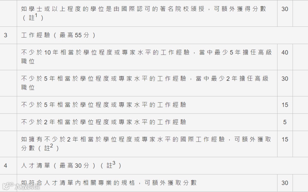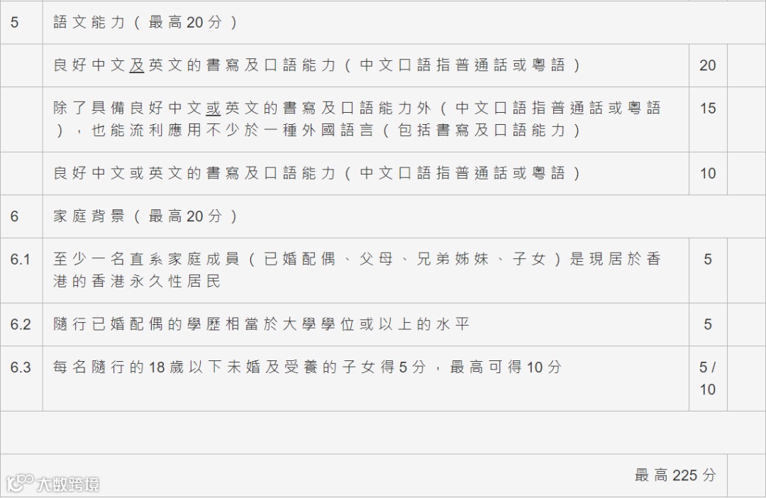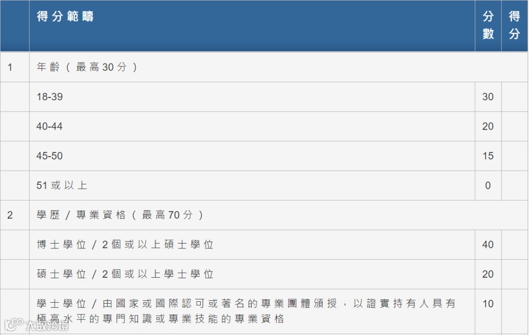 1) 综合计分制:最高225分,最低及格分数80分(根据申请人年龄、学历和工作经历等方面进行打分)