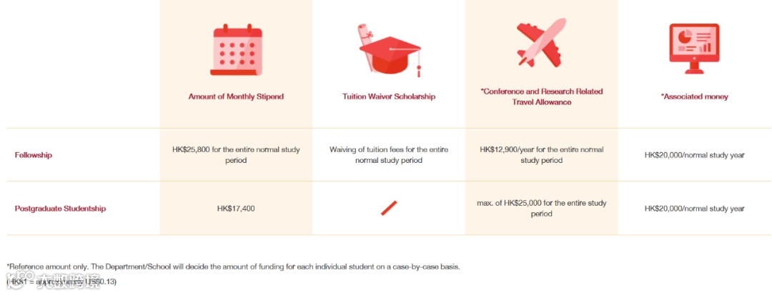 成功申请者可享受全额免学费、每月奖学金(HK$17,000~25,800)以及研读期间其他资助(如每年HK$12,900~25,000的会议差旅补贴等)。另外申请将作快速审核,录取结果于短期内发放。
