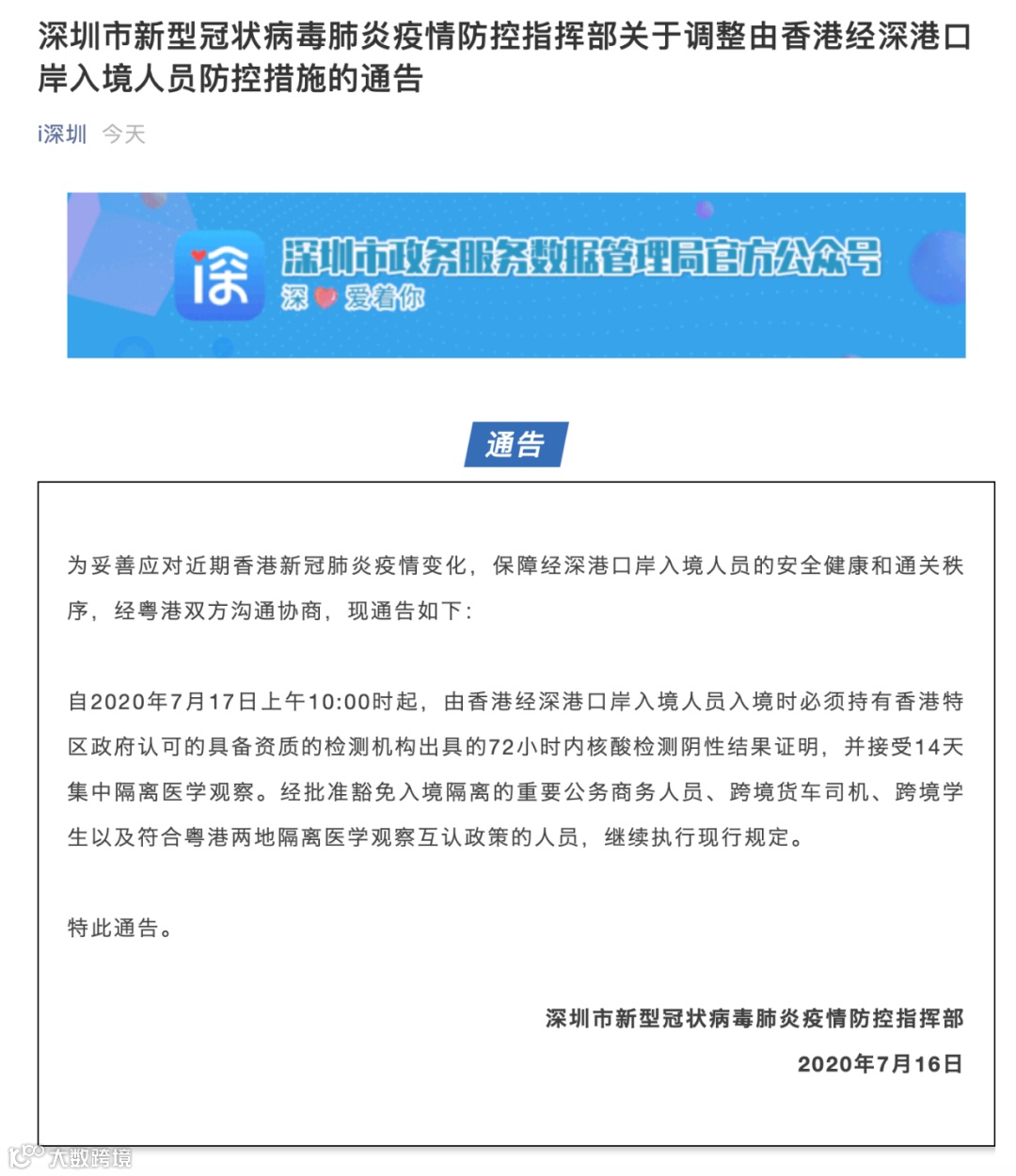 自2020年7月17日上午10:00时起,由香港经深港口岸入境人员入境时必须持有香港特区政府认可的具备资质的检测机构出具的72小时内核酸检测阴性结果证明,并接受14天集中隔离医学观察。