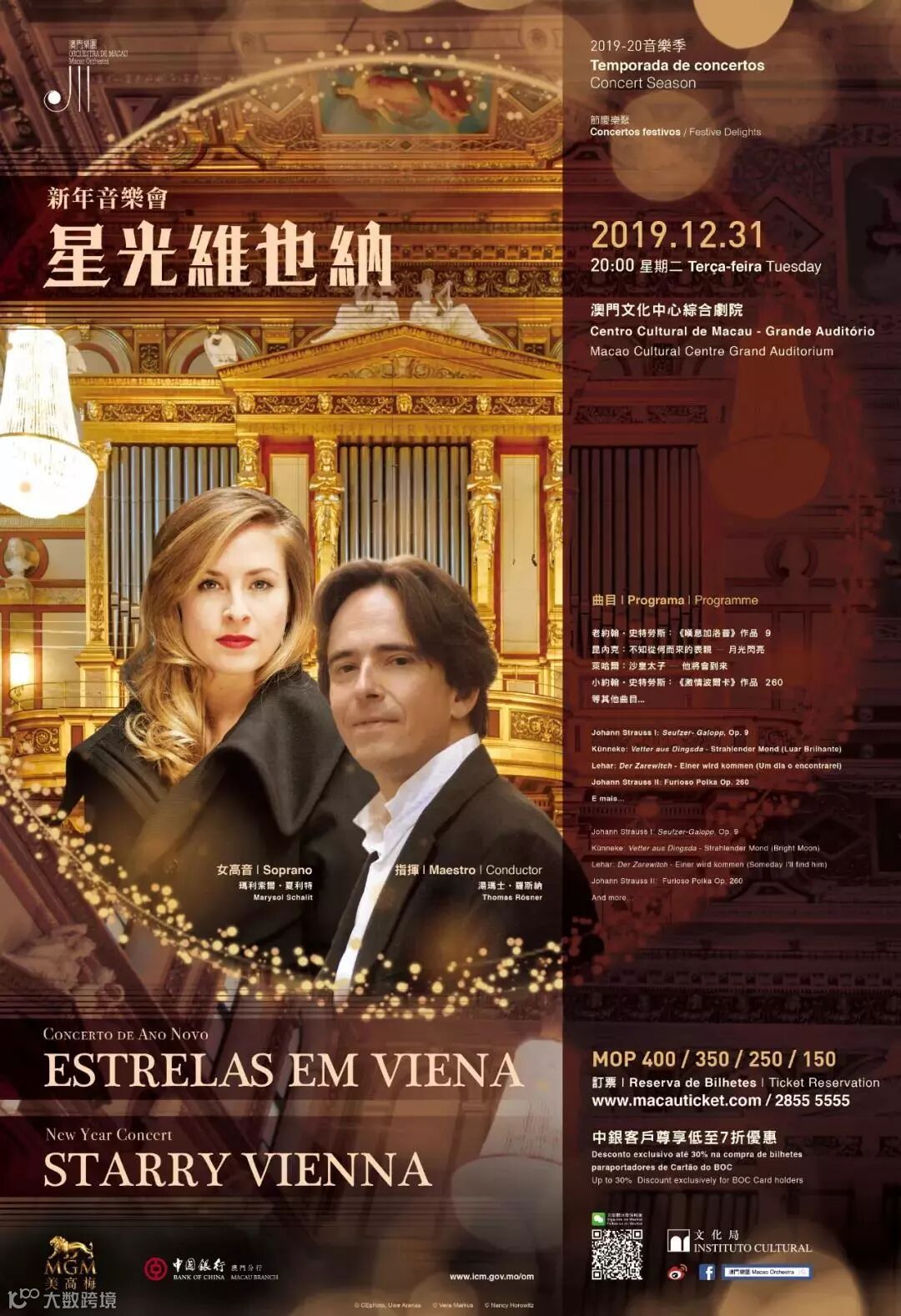 在新年伊始之际,澳门乐团将携手奥地利著名指挥家Thomas Rösner、才貌双全的瑞士女高音歌唱家Marysol Schalit,为大家奉献一场来自斯特劳斯家族的音乐盛宴~