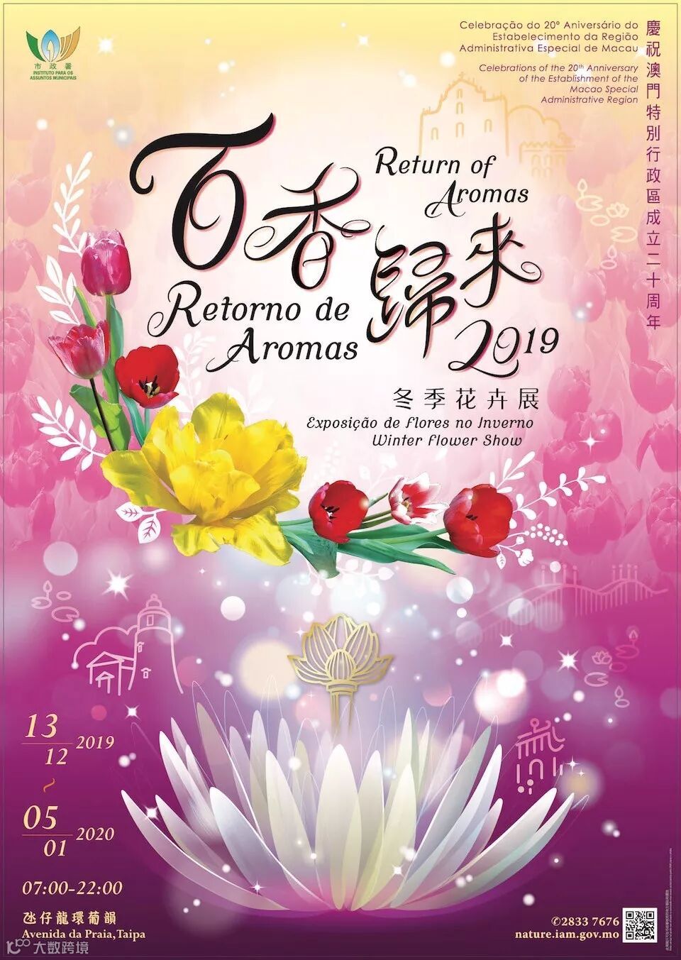 展览期间,澳门多个主要公园和花园摆满了缤纷美丽的郁金香,毗邻氹仔龙环葡韵的主要展览场地还设有花卉艺术展览、比赛、讲座和文化表演。