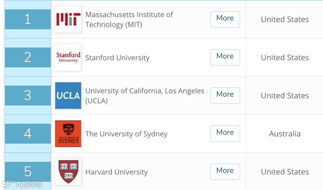 4所美国大学:MIT(1)、斯坦福大学(2)、UCLA(3)、哈佛大学(5)