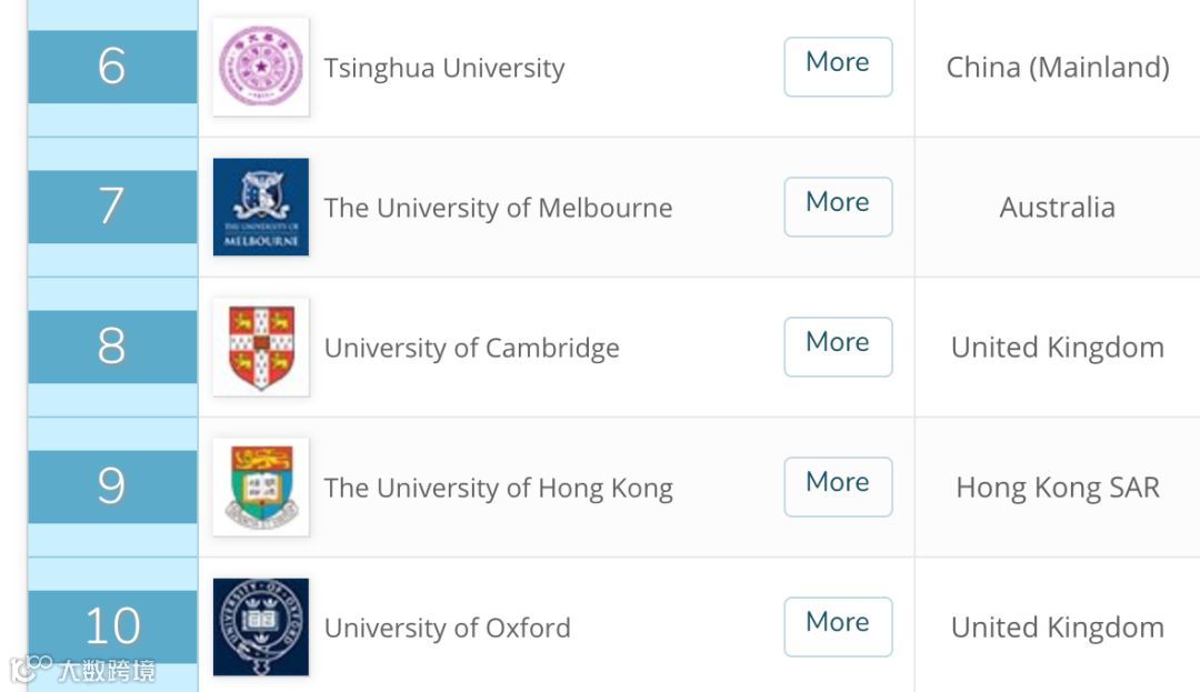 其中清华大学比去年上升了3个名次,香港大学也挤进了Top10!